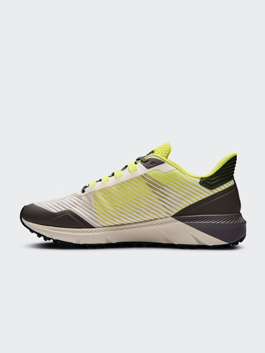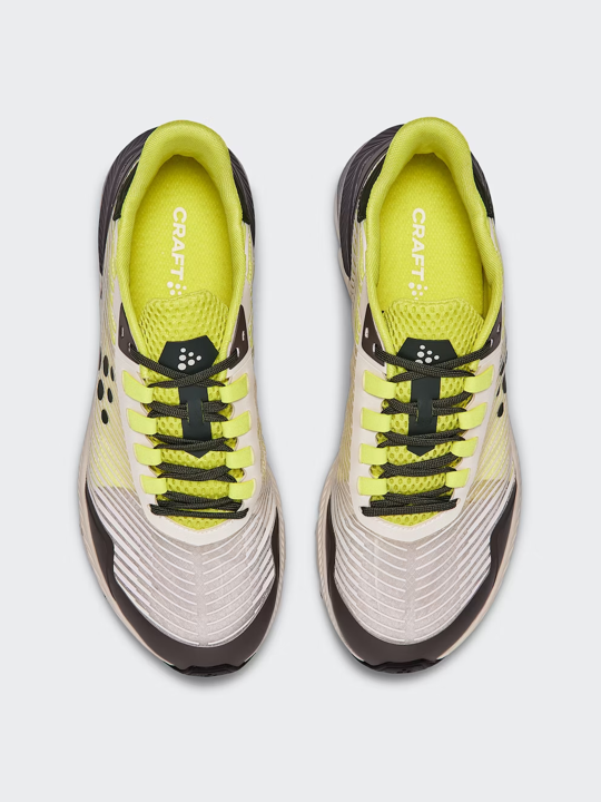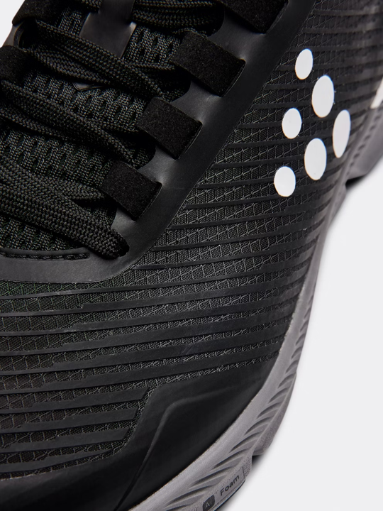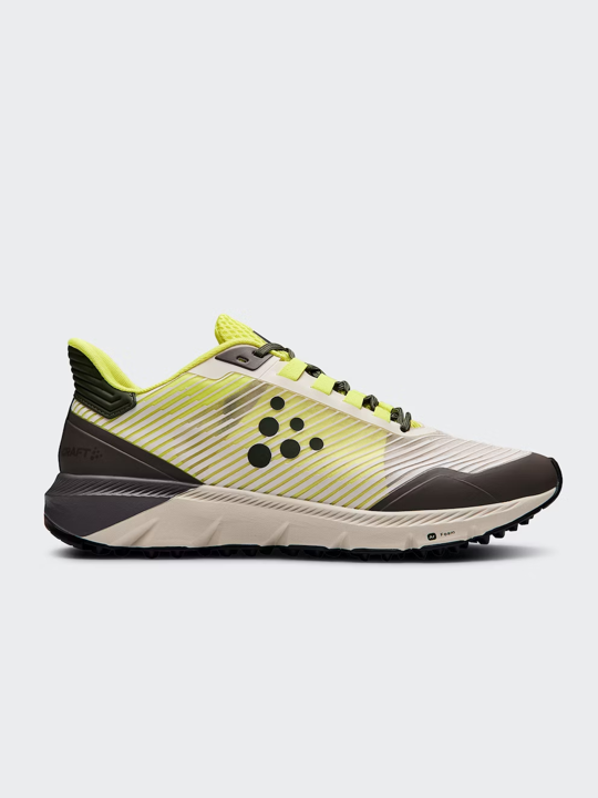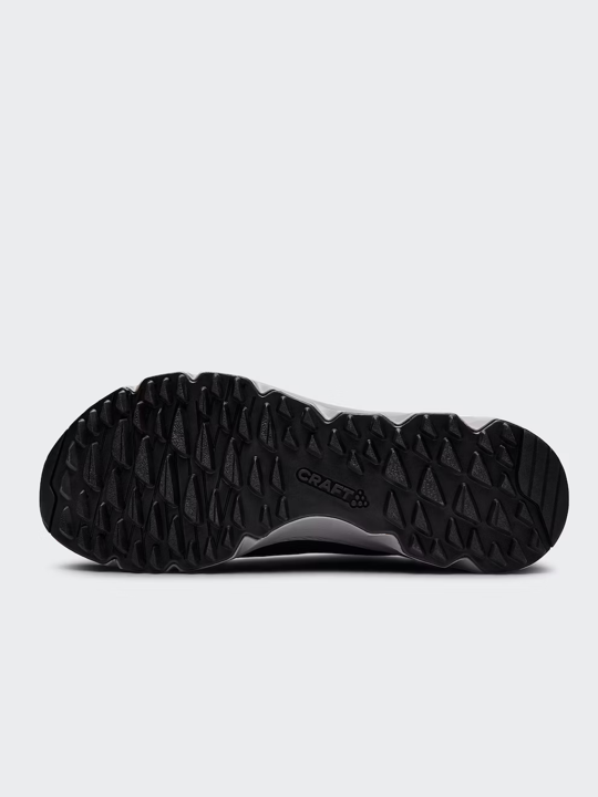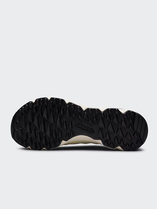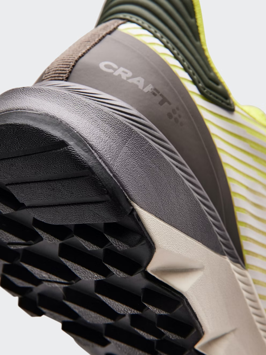 - El dibujo triangular de estructura orgánica en la suela exterior proporciona tracción y flexibilidad, mientras que la almohadilla del talón permite el desacoplamiento para distribuir el peso a lo largo de la zancada.
